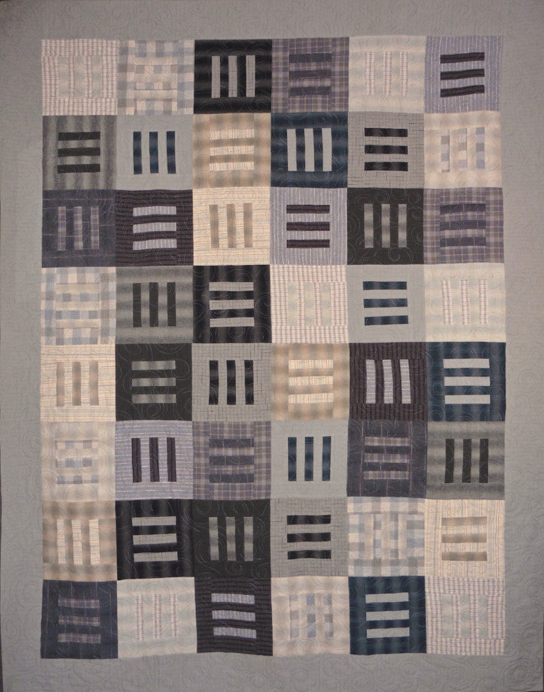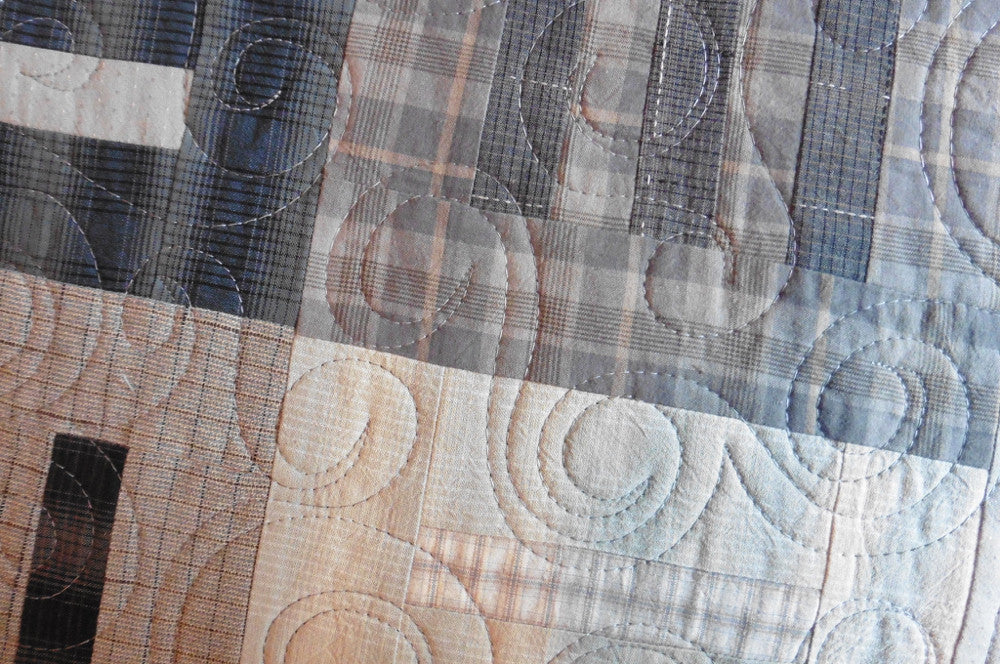 This quilt features gorgeous textured yarn dyed fabrics from Japan in a lovely range of warm beige, soft blue, grey and charcoal. The pattern called Modern Thinking was designed by Janine Burke of Designs by jb - it is available for purchase - and my retired store sample was sold with permission. This quilt measures 62" x 80" and is appropriate for a large throw. The machine quilting in a coordinating thread can been seen in the close up photo.