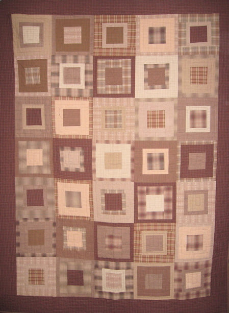 This quilt features yarn dyed fabrics from Japan in a lovely range of muted pink, soft burgundy and brown. The pattern called Square Pegs was designed by Nellie Holmes of Originellie's and my retired store sample was sold with permission. This quilt measures approximately 62" x 82," which is appropriate for a large throw.