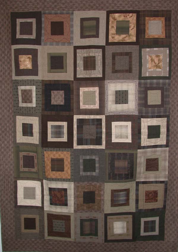 This quilt features yarn dyed fabrics from Japan in a lovely range of cream, tan, taupe, grey and brown.  The pattern called Square Pegs was designed by Nellie Holmes of Originellie's and my retired store sample was sold with permission. This quilt measures approximately 62" x 82," which is appropriate for a large throw.