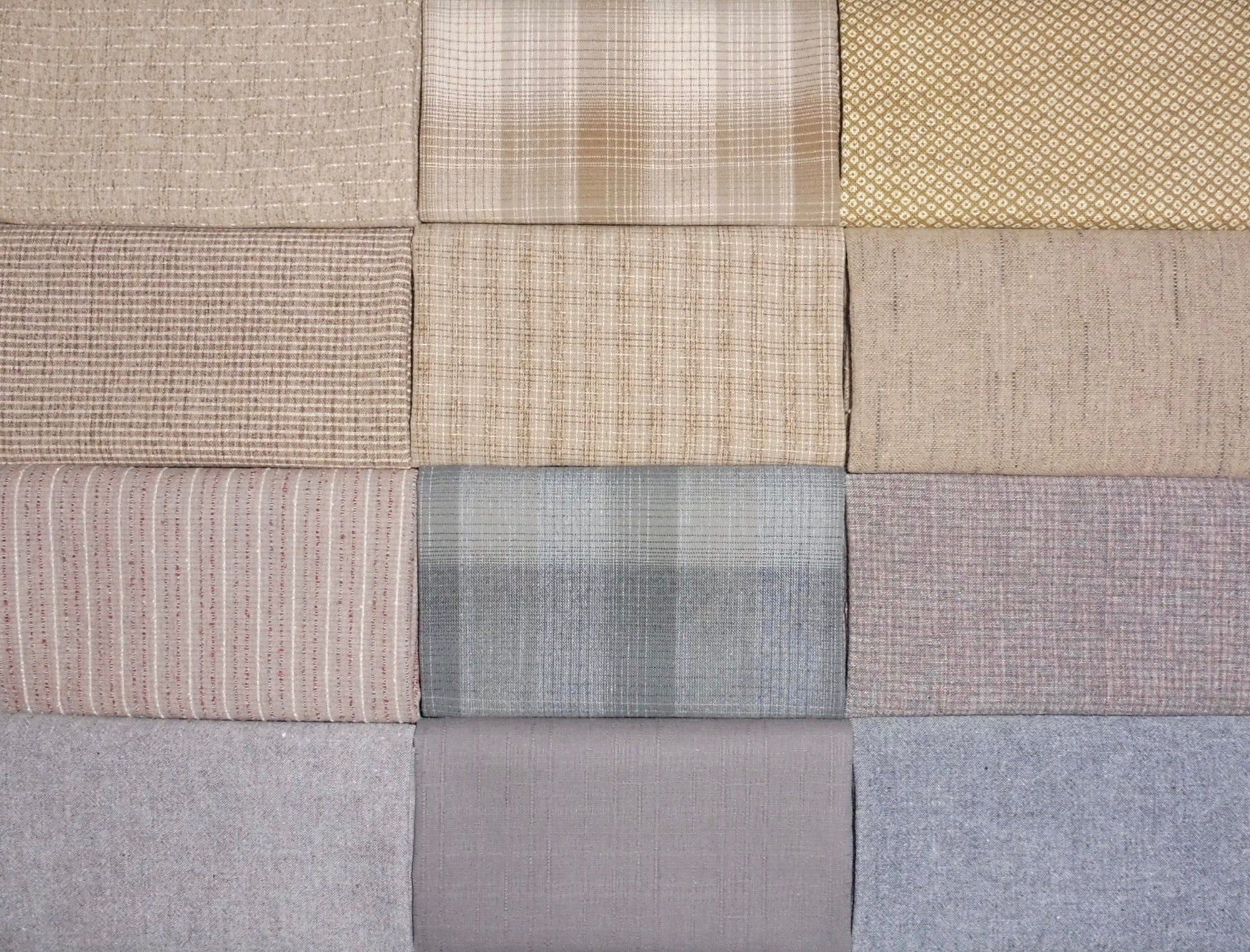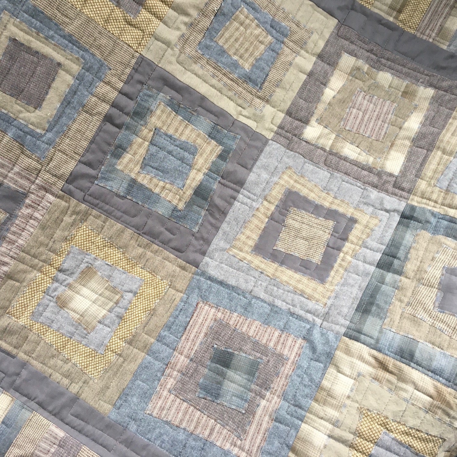 Kallisti's Tilt-a-Square features textured Japanese fabrics, both dobby cloth and yarn dyes, in beige, tan and grey.  This pattern is an old favourite designed by Bella Nonna.  This quilt measures approximately 42" x 52," which is appropriate for a lap or small throw.