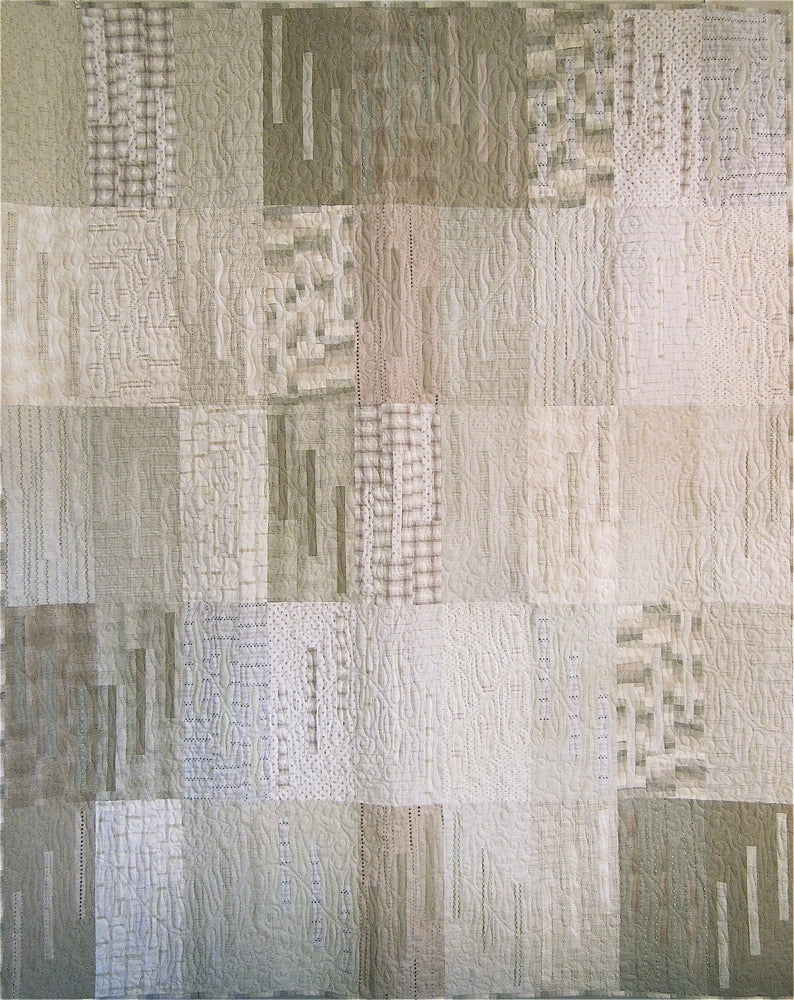 This quilt features gorgeous textured yarn dyed fabrics from Japan in a range of cream and beige. The pattern is called Whisper and was designed by Janine Burke of Designs by jb. My retired store sample was sold with permission. This quilt measures 63" x 75" and is appropriate for a large throw or wall hanging. The stunning machine quilting is a scroll pattern that accentuates the meandering design of the blocks.