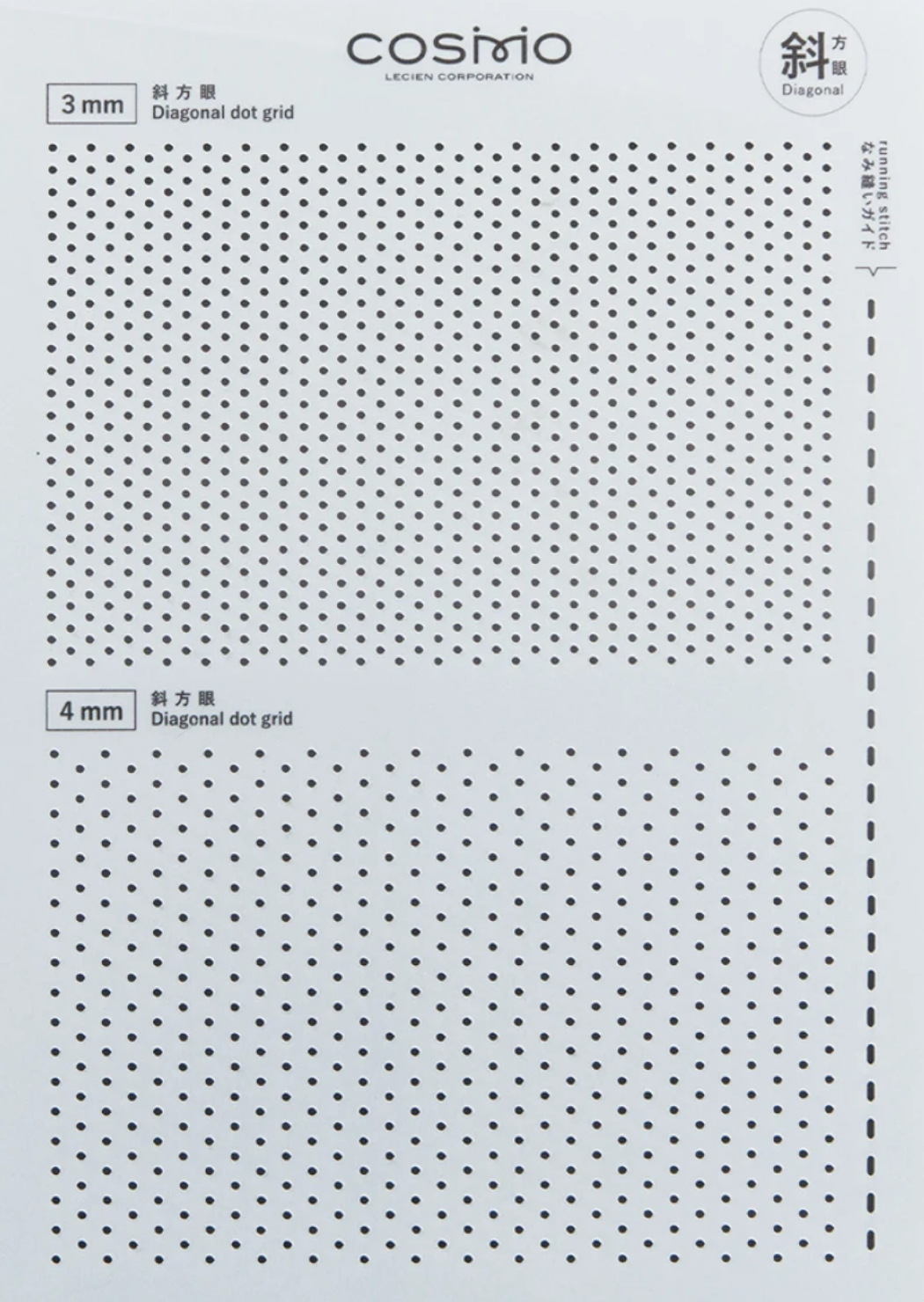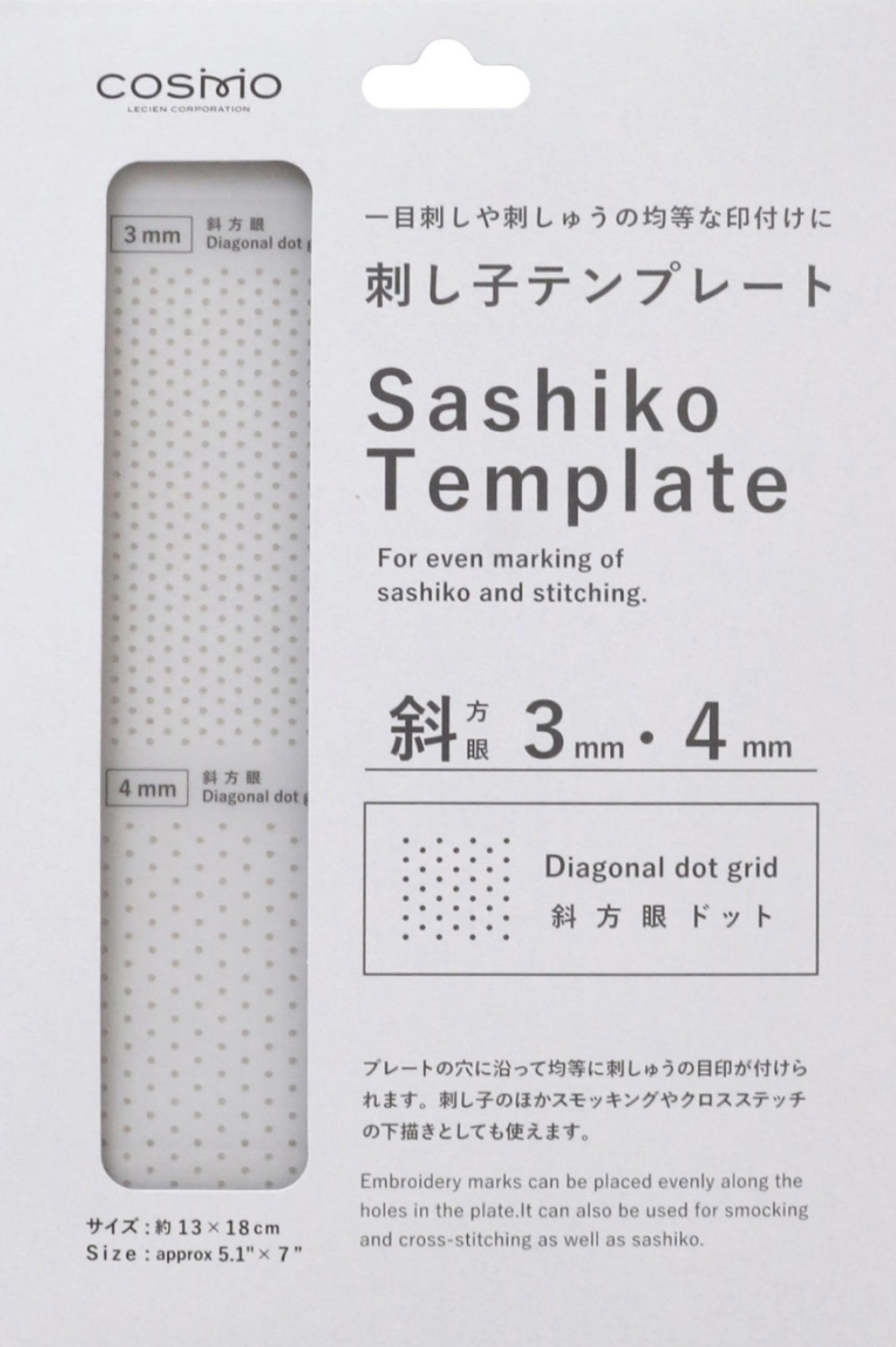 From Cosmo of Japan, this template allows for quick and easy way transfer of a dot grid to your fabric for Sashiko stitching. Package includes both 3 mm. and 4 mm. diagonal grid. Best used with chalk pouncer.