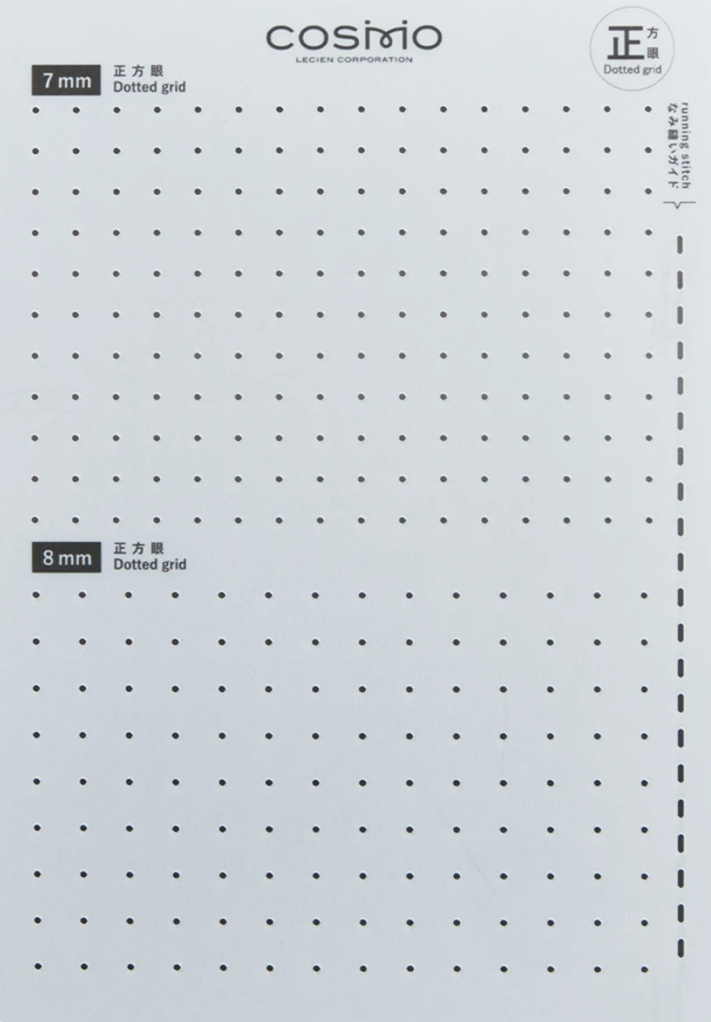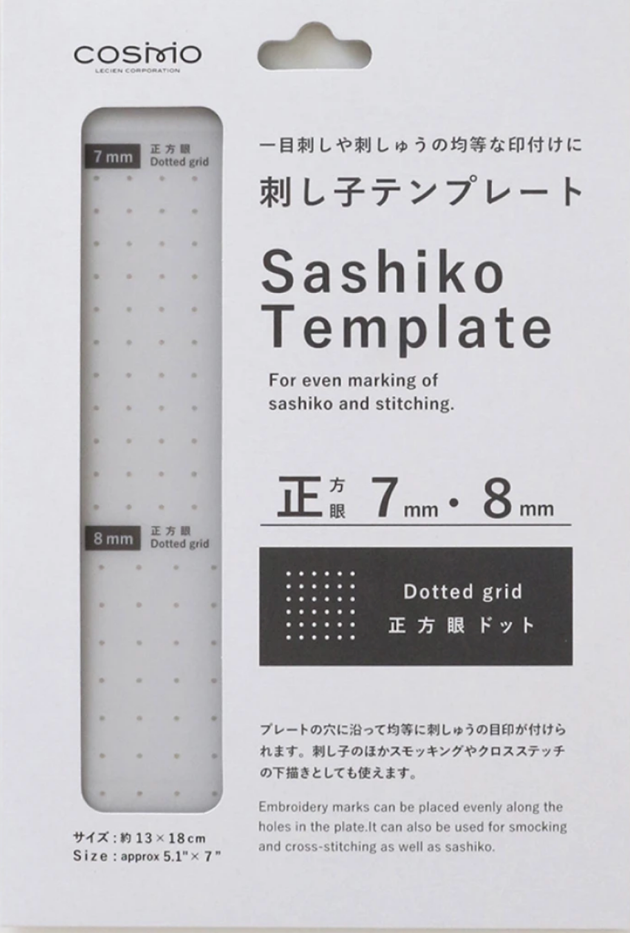 From Cosmo of Japan, this template allows for quick and easy way transfer of a dot grid to your fabric for Sashiko stitching. Package includes both 7 mm. and 8 mm. straight grid. Best used with chalk pouncer.