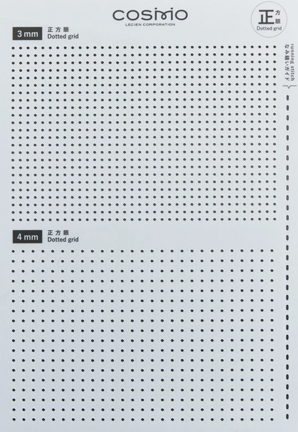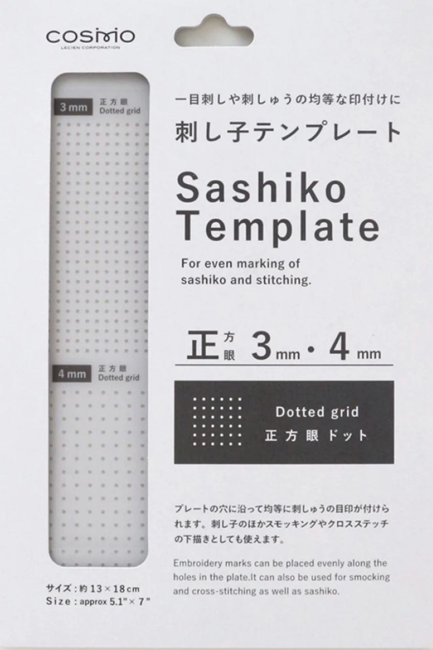 From Cosmo of Japan, this template allows for quick and easy way transfer of a dot grid to your fabric for Sashiko stitching. Package includes both 3 mm. and 4 mm. straight grid. Best used with chalk pouncer.