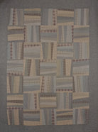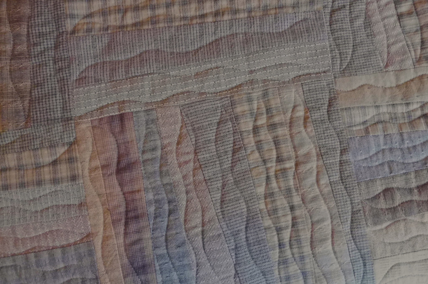This quilt features the very popular Japanese yarn dyed fabrics in a range of muted blue, warm grey, muddy tan and taupe.  The pattern is called A Bit Askew - a simple, modern version of the traditional Rail Fence - and was designed by Janine Burke of Designs by jb.  My shop sample is being sold with permission.  This quilt measures 56" x 67" and is appropriate for a throw quilt. Details of the professional machine quilting can be seen in the closeup photo.