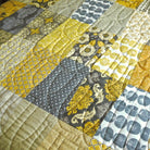 This quilt pattern is a variation on the traditional Tumbler called Trapezoids and was created by teacher and award winning designer Johanna Masko. Kallisti's sample is being sold with permission. It features a modern palette of cream warm yellow and grey quilting prints from various American designers. The size is approximately 91" x 106," which is appropriate for a Double bed with an 18.5" drop, a Queen bed with a 15.5" drop or a King with a foot board.