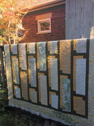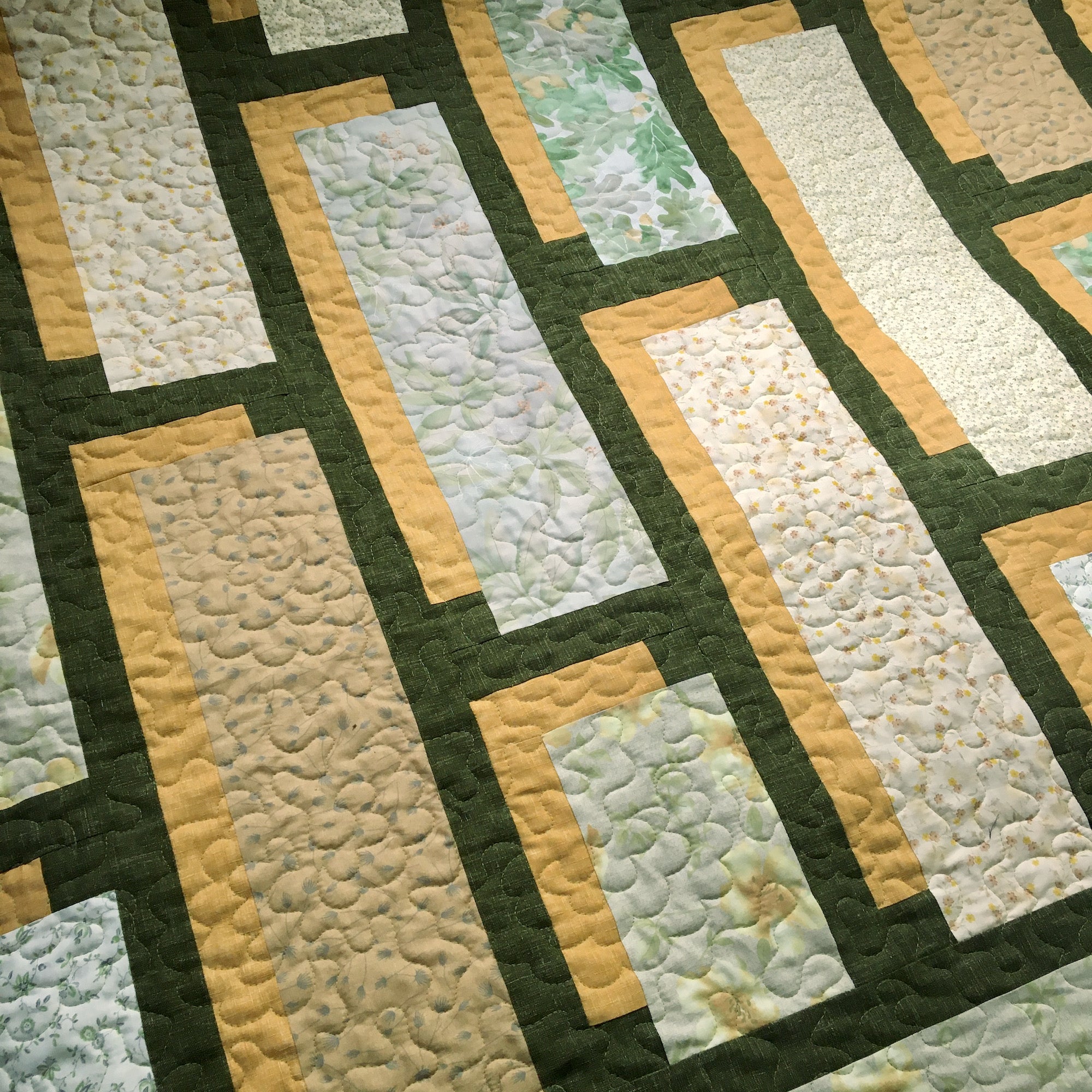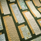 One of two recent Shadowbox quilts, this version features gorgeous Japanese Blender prints in rare yellow and warm green on a deep olive green Japanese Dobby solid. The quilt pattern called Shadowbox was designed by Kari Nichols of Mountainpeak Creations and is available for purchase separately. The quilt measures 67" x 80" and is appropriate for a large throw. It has been reduced by 50% of its original price.