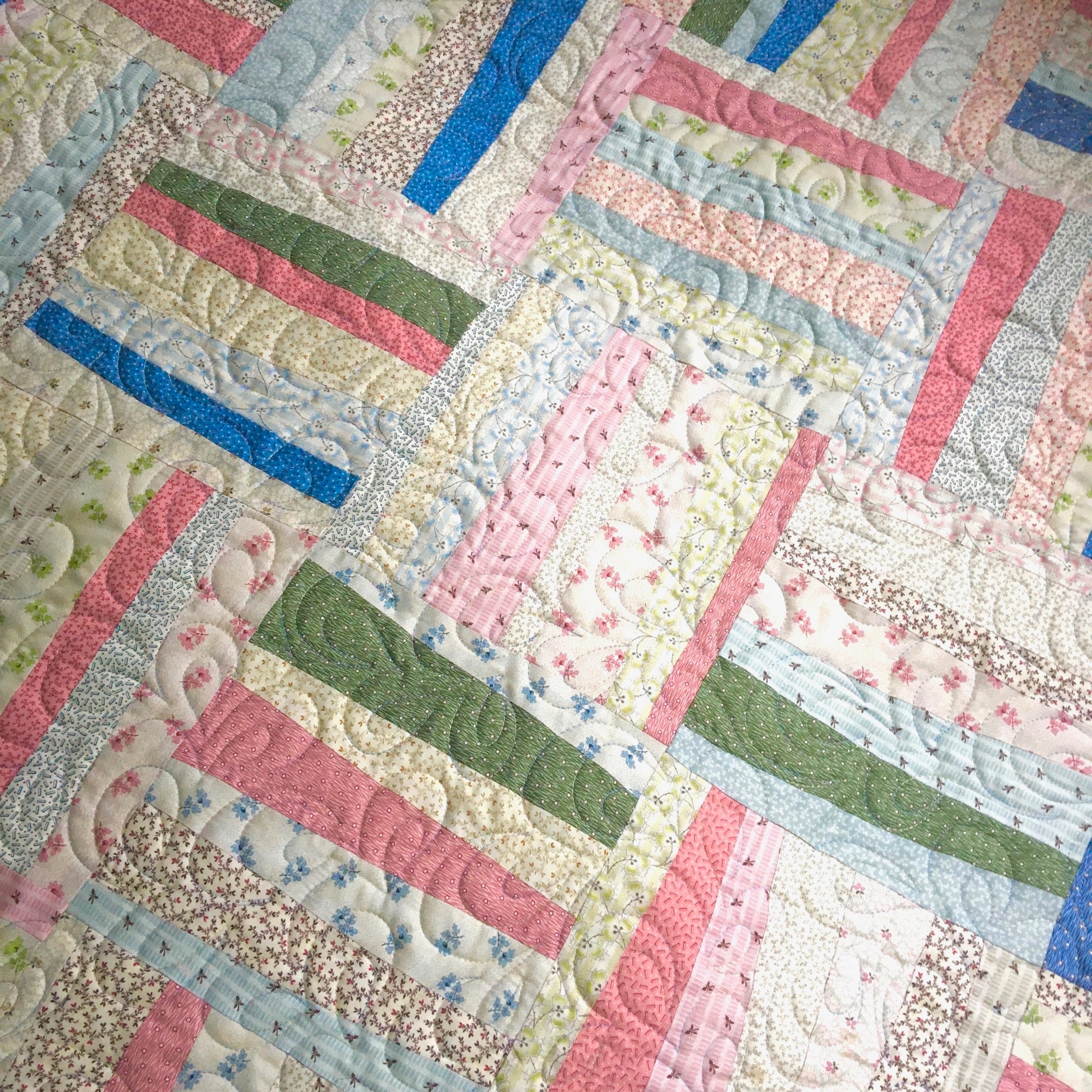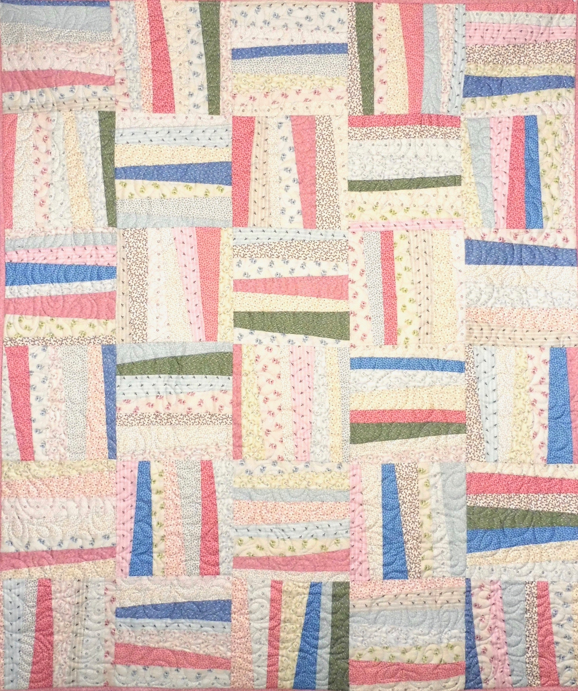 This quilt features 24 sweet Japanese floral prints from Junko Matsuda's premiere Textile Pantry collection. The Janine Burke pattern features strips of fabric cut crookedly for a great modern look with a nod to the traditional crazy patch quilt. My shop sample is being sold with permission. It finishes approximately 45" x 54," which is appropriate for a lap or small throw.