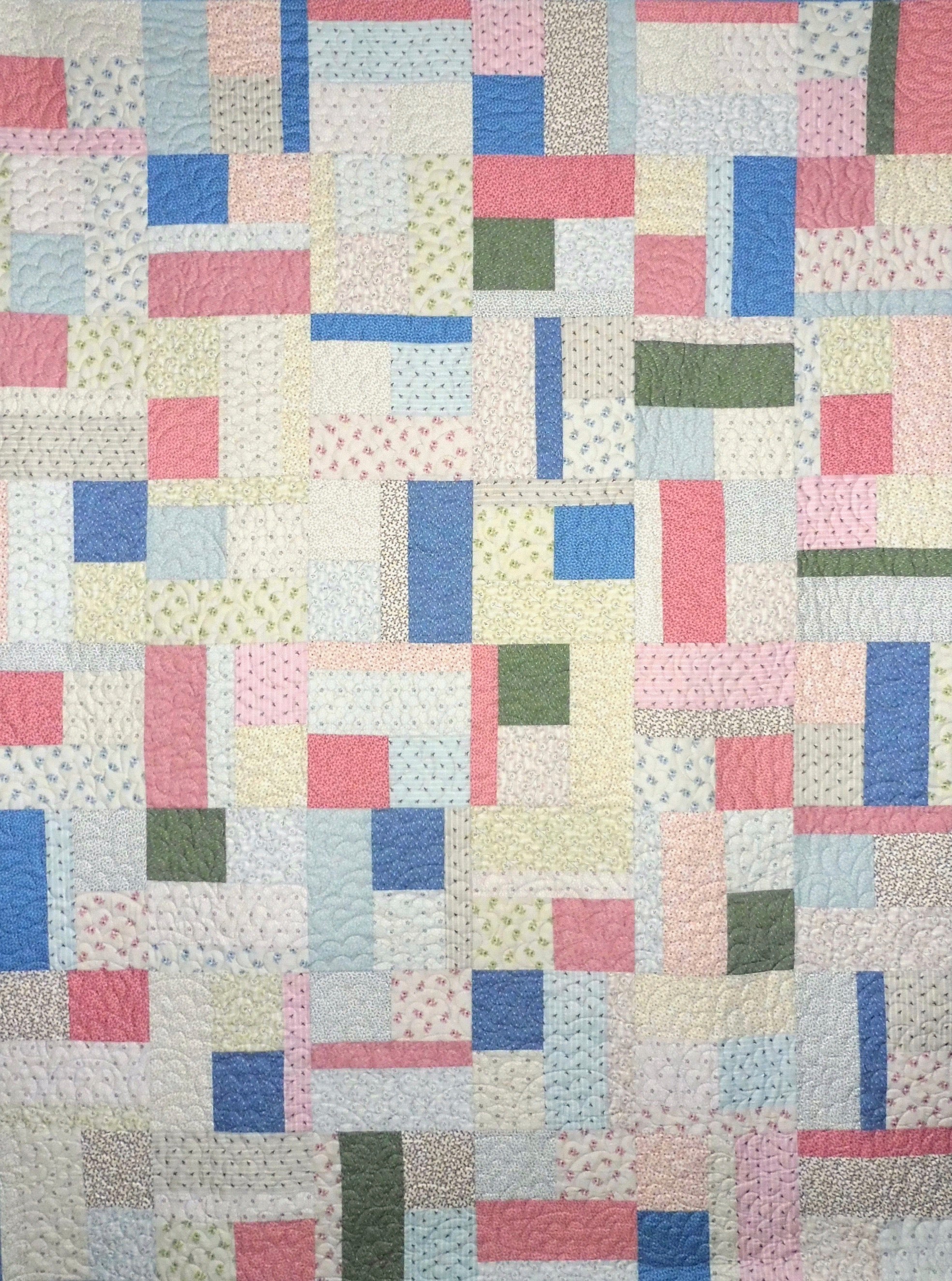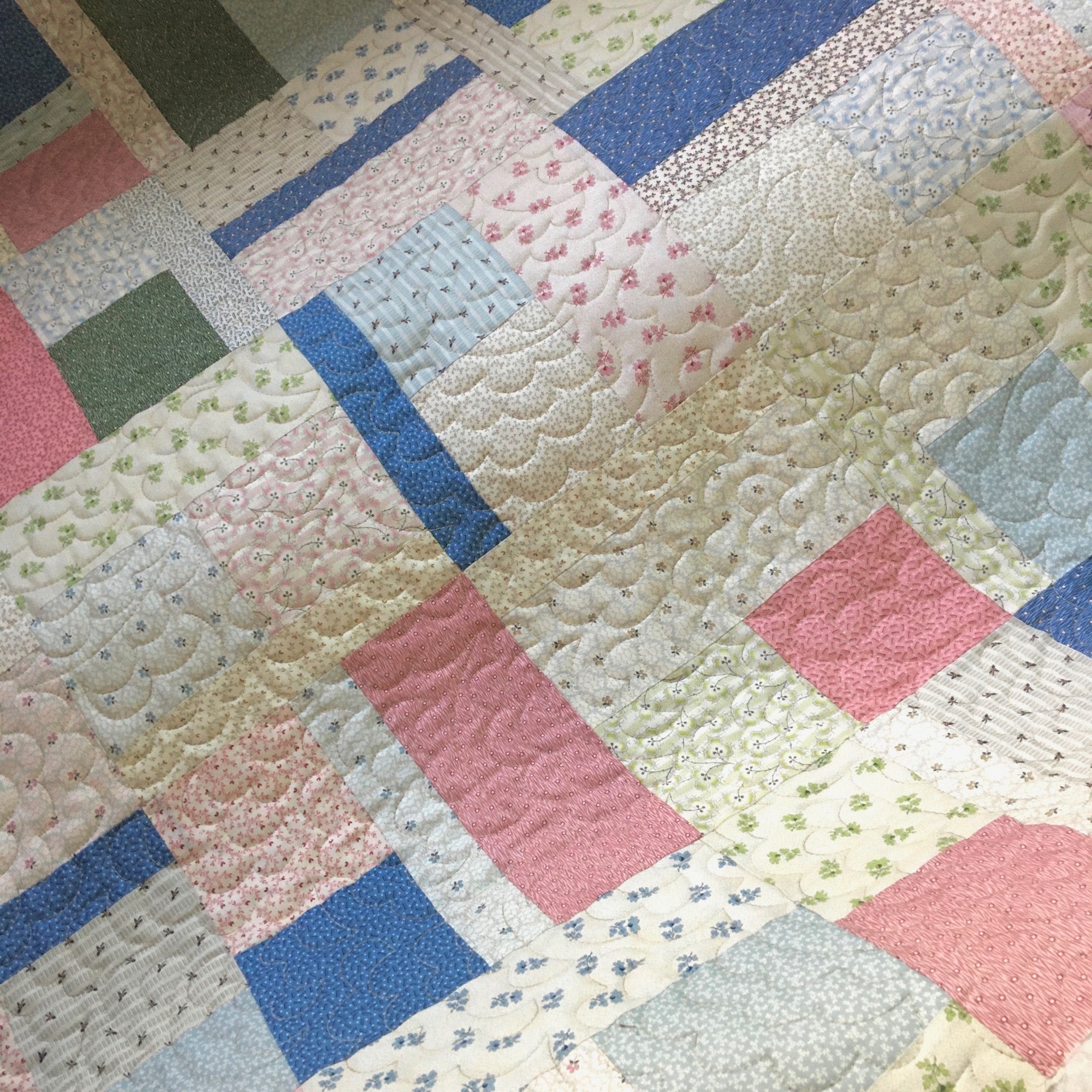 This quilt features 24 sweet Japanese floral prints from Junko Matsuda's premiere Textile Pantry collection. The Kari Nichols (Mountainpeek Creations) pattern features square blocks made of various rectangle configurations for a simple modern look. My shop sample is being sold with permission. It finishes approximately 53" x 71," which is appropriate for a lap or small throw.