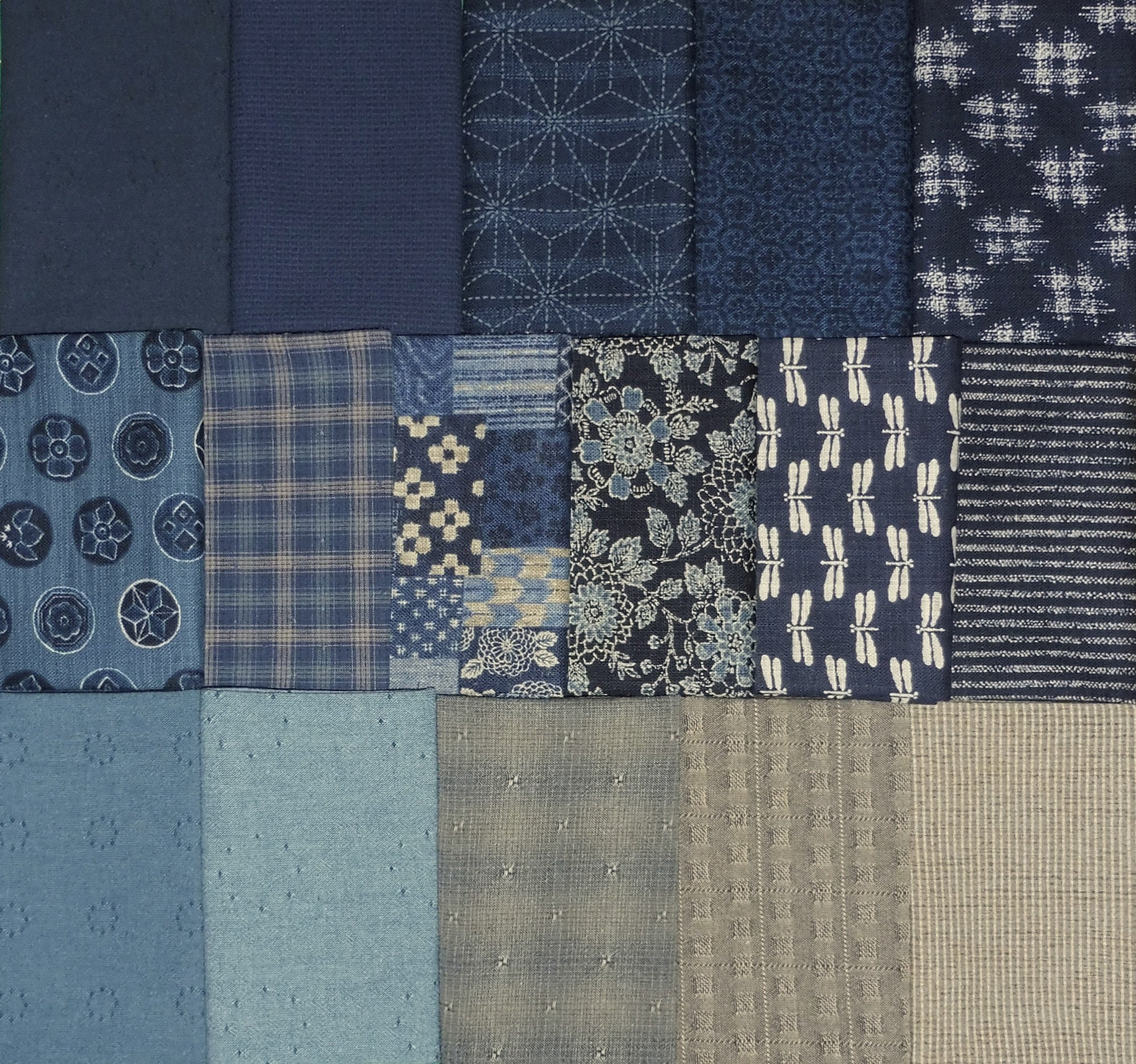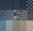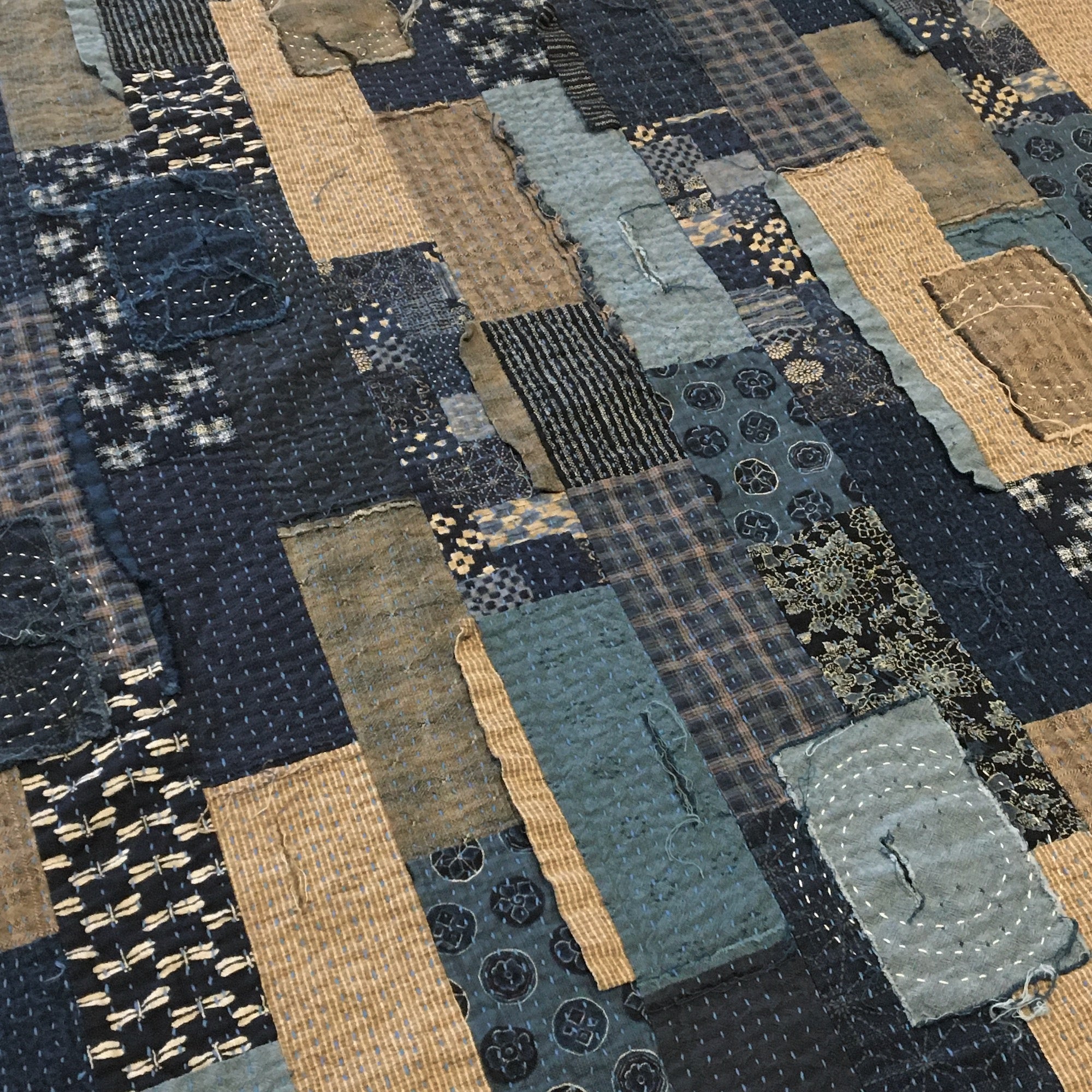 Kallisti used Bella Nonna's Color Splash pattern to create a Japanese boro style quilt and then add various features to make it even more similar to an authentic boro piece. The quilt includes 16 Japanese dobby and yarn dye fabrics in medium warm neutrals and shades of deep blue. It was hand stitched with thin bright medium blue Sashiko thread with stitching accents in thin off-white. This quilt measures approximately 34" x 42." Custom orders are welcome!