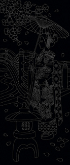 This preprinted Japanese Sashiko fabric features a geisha in the garden. This black panel is 100% cotton and measures approximately 18" wide x 45" long. Stitch on stamped lines with Sashiko thread, embroidery floss or pearl cotton. Stamped lines dissolve in water.