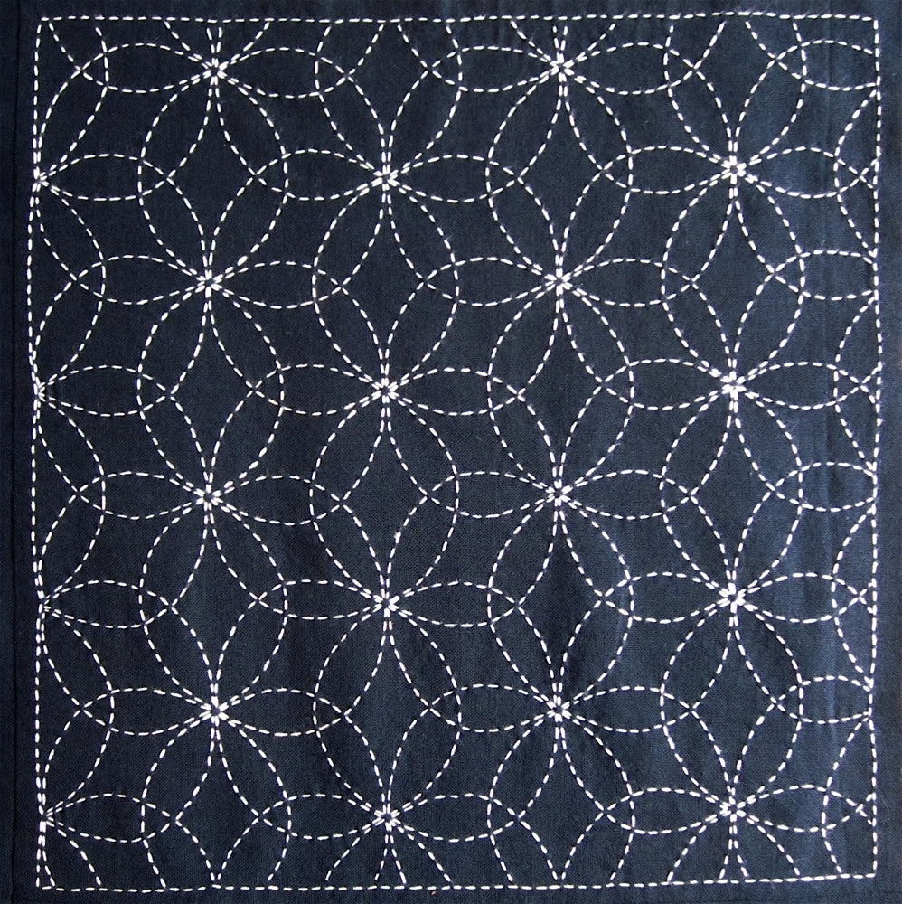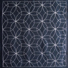 This very popular preprinted Japanese sashiko fabric features one of the best known designs, the hemp leaf, an ancient pattern symbolizing radiating light and good health. Stitch on stamped lines with sashiko thread, embroidery floss or pearl cotton. Pale blue stamped lines dissolve in water. Panels are 100% navy blue cotton and measure 14" x 28" each. Stamped design is 14" square, covering half of the panel, and a plain square, which can be used as the back of a pillow or bag, makes up the other half.