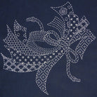 This preprinted Japanese sashiko fabric features paper ribbons, traditionally attached to gifts as a good luck wish. Stitch on stamped lines with sashiko thread, embroidery floss or pearl cotton. White stamped lines dissolve in water. Panels are 100% navy blue cotton and measure 14" x 28" each. Stamped design is 14" square, covering half of the panel, and a plain square, which can be used as the back of a pillow or bag, makes up the other half.