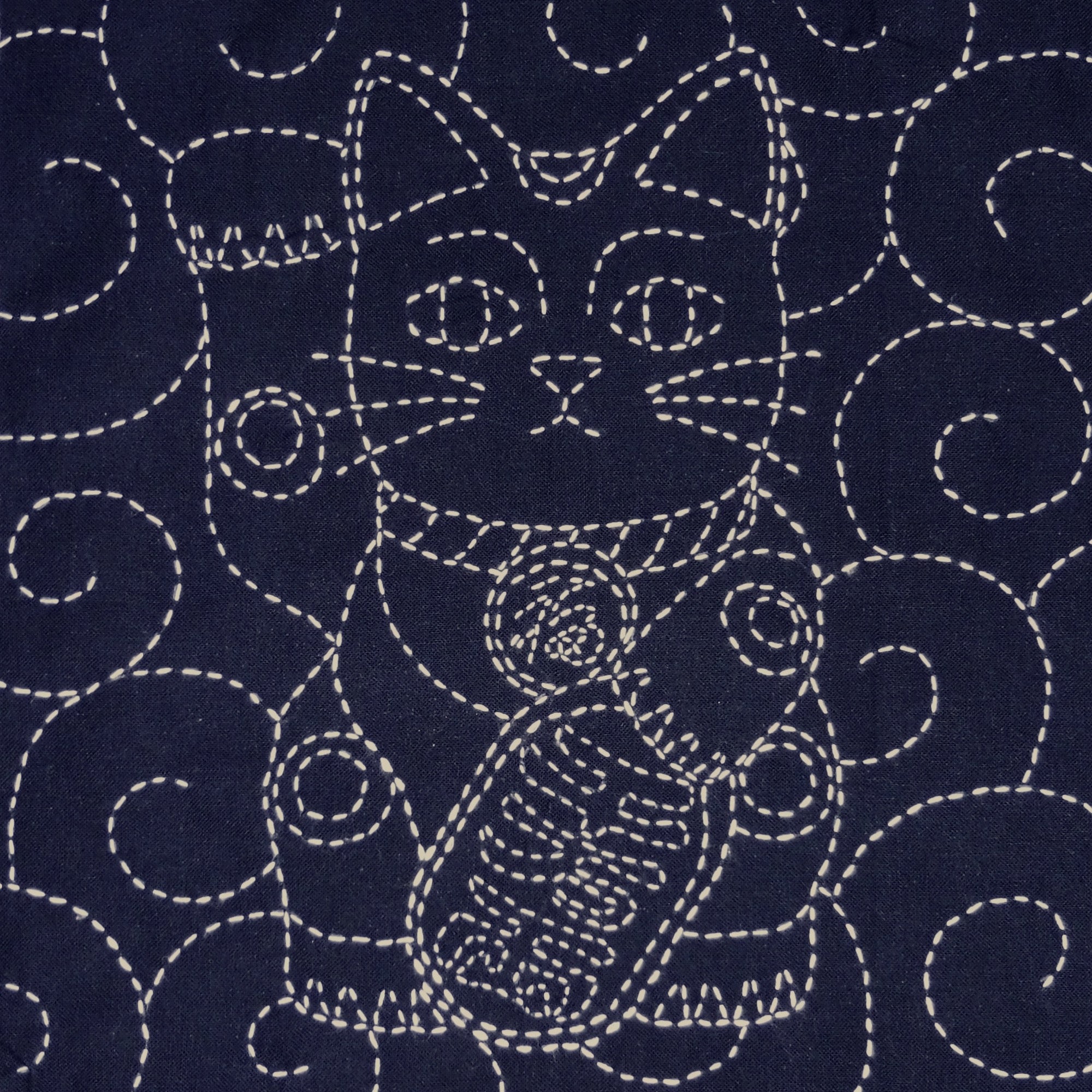 This preprinted Japanese sashiko fabric features the iconic beckoning cat, symbolic of good luck and prosperity. Stitch on stamped lines with sashiko thread, embroidery floss or pearl cotton. White stamped lines dissolve in water. Panels are 100% navy blue cotton and measure 14" x 28" each. Stamped design is 14" square, covering half of the panel, and a plain square, which can be used as the back of a pillow or bag, makes up the other half.