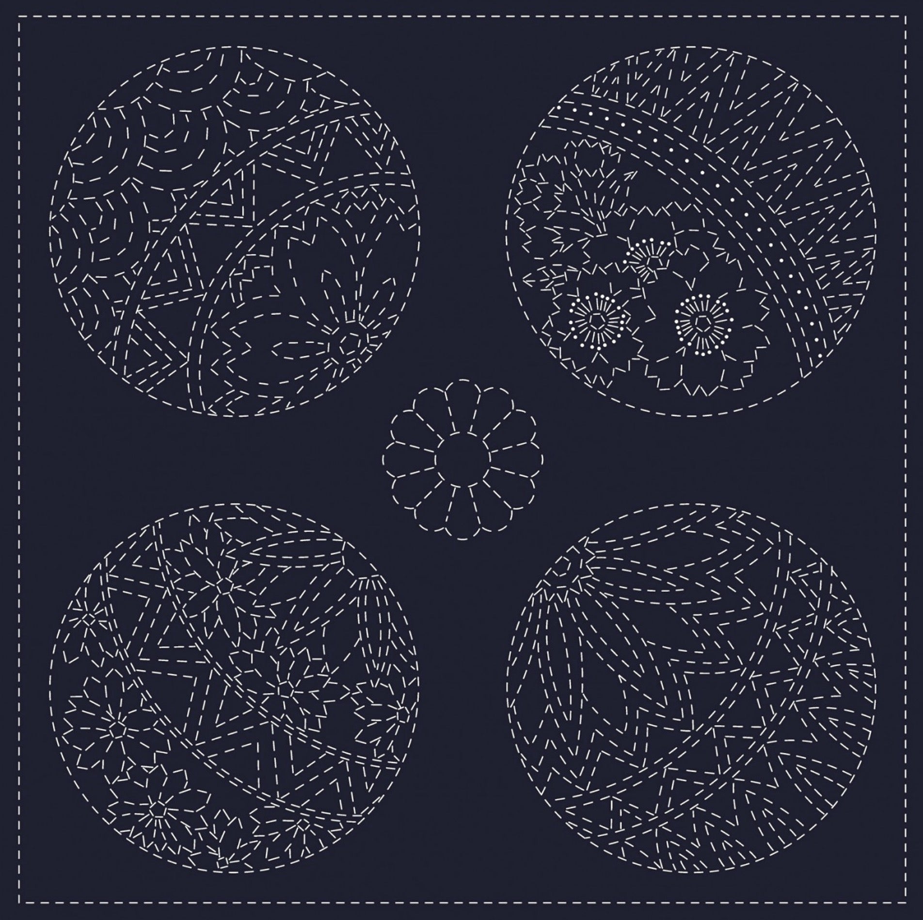 This preprinted Japanese sashiko fabric features four detailed temari balls. Stitch on stamped lines with sashiko thread, embroidery floss or pearl cotton. Stamped lines dissolve in water. Panels are 100% navy blue cotton and measure 14" x 28" each. Stamped design is 14" square, covering half of the panel, and a plain square, which can be used as the back of a pillow or bag, makes up the other half.