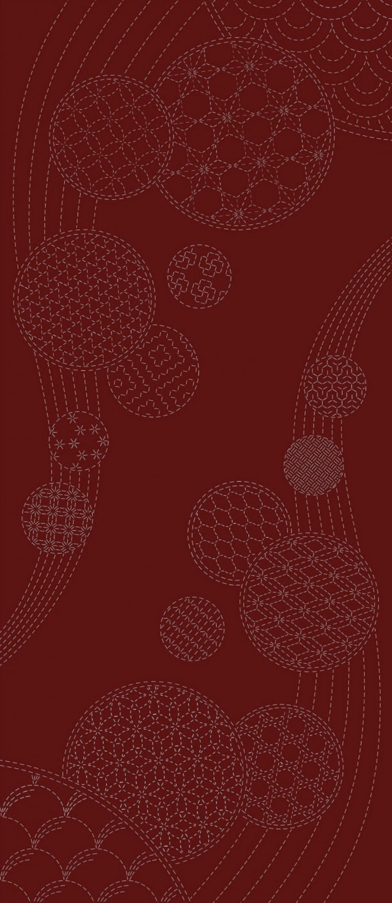 This preprinted Japanese sashiko fabric features decorative orbs swaying in the breeze. This deep red panel is 100% cotton and measures approximately 18" wide x 45" long. Stitch on stamped lines with sashiko thread, embroidery floss or pearl cotton. Stamped lines dissolve in water.