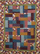 This quilt focuses on one larger scale, multicoloured Japanese print, which is used as the border and also scattered through the top with coordinating prints of all colours. The pattern is called Bits and Pieces and was designed by Mountainpeek Creations. My shop sample was sold with permission. This quilt measures approximately 49" x 58," which is appropriate for a throw quilt.