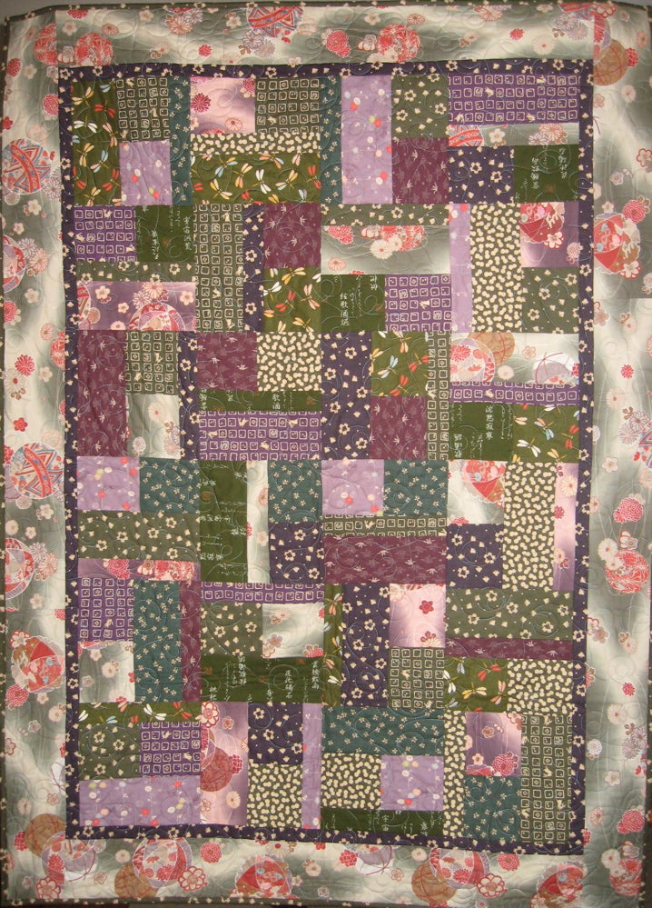 This quilt features beautiful Japanese floral prints in a range of soft green and purple. The pattern is called Bits and Pieces and was designed by Mountainpeek Creations. My shop sample was sold with permission. This quilt measures approximately 49" x 58," which is appropriate for a throw quilt.