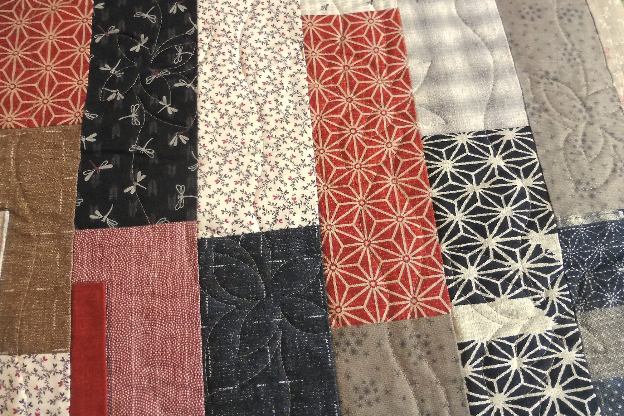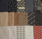 Kallisti's most recent version of Color Splash features Japanese prints, textured dobby cloth and yarn dyes in beige, brown and black with barn red accents. This pattern is an old favourite designed by Bella Nonna and my store sample was sold with permission. This quilt measures approximately 52" x 63," which is appropriate for a lap or small throw.