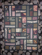This quilt features gorgeous textured cotton fabrics imported from Japan. Prints include traditional floral motifs mixed with yarn dyes. Colors are a dark and calming blend of navy blue, purple and gray. The pattern is called County Lines and designed by Mountainpeek Creations. My retired store sample was sold with permission. Details of the lovely professional machine quilting can be seen in the closeup photo. It features dense chrysanthemums in a tranquil water pattern. The quilt measures 47" x 59," which is appropriate for a wall hanging or small throw.
