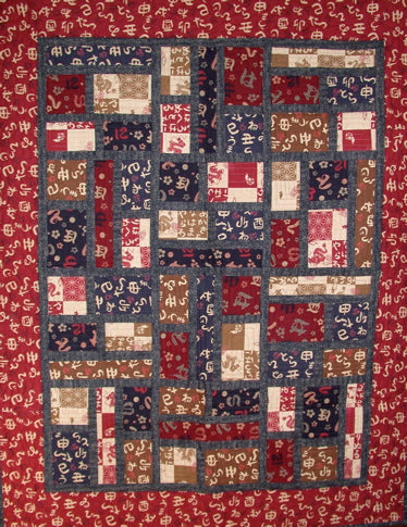 This quilt features gorgeous textured cotton fabrics imported from Japan. Prints include traditional kanji motifs, some with animals. Colours are also traditional dark blue, deep red, tan and cream. The pattern is called County Lines and was designed by Mountainpeek Creations. My retired store sample was sold with permission. The quilt measures approximately 46" x 59," which is appropriate for a wall hanging or small throw.