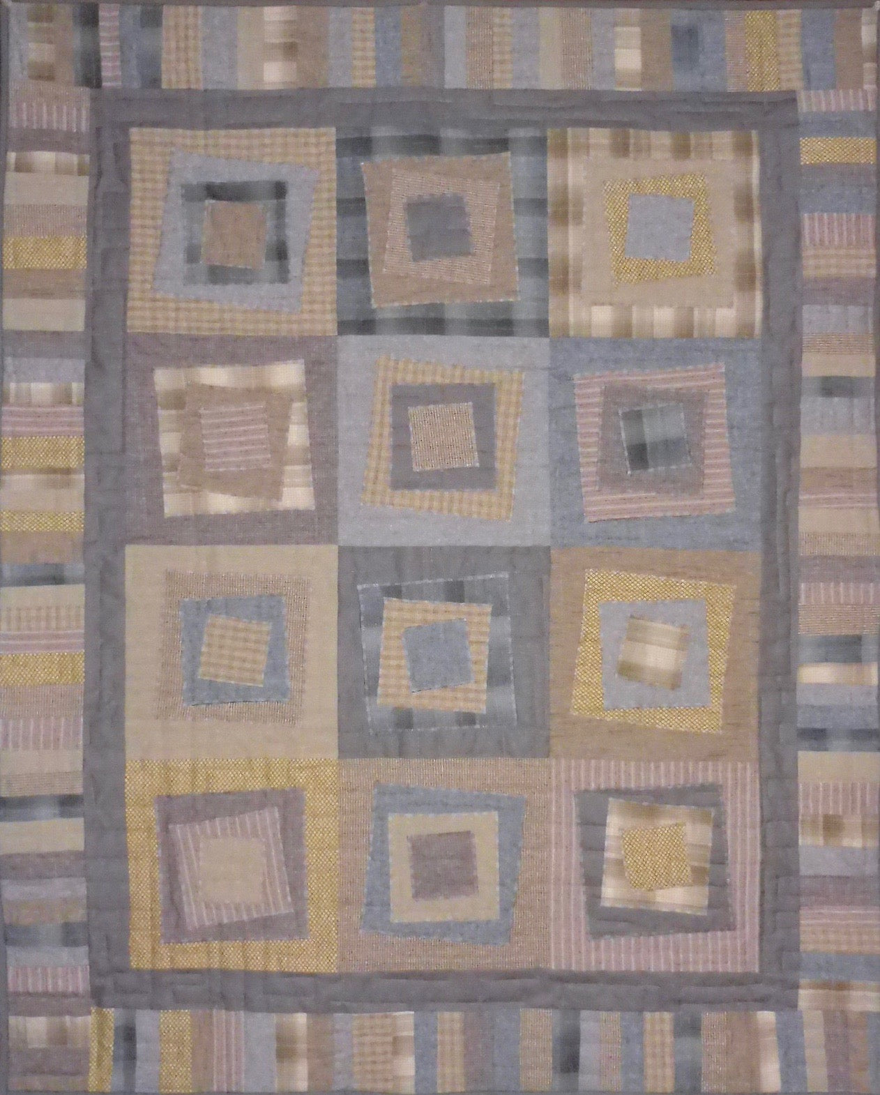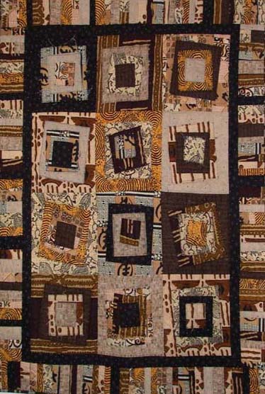 The additional photos show two versions of Tilt-a-Square made by Kallisti Quilts. The first one is a current quilt kit made with Japanese textured fabrics in neutral colours and the second quilt showcases West African prints.